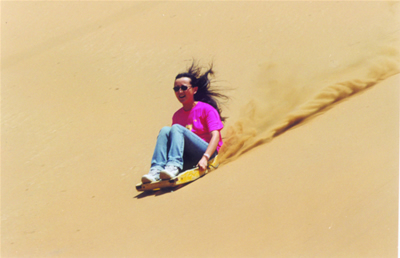 ? ? ? ? ?滑沙,即乘坐滑板從高高的沙山頂自然下滑,滑板用木質(zhì)、竹子、塑料等材料制成,坐在滑沙板上,兩手撐在板壁上,雙腳蹬住前沿,身體微向前傾,下滑時(shí)隨著沙山的坡度加大和下滑速度的加快,頓覺兩耳生風(fēng),轉(zhuǎn)眼之間就沖到了山下,在有驚無險(xiǎn)的瞬間體味到了刺激與快感。滑沙滑道坡度一般為45°,游客乘滑沙板以每秒20米的速度下滑,隨著慣性的加大,速度越來越快,驚險(xiǎn)刺激又絕對安全?;尺\(yùn)動(dòng)類似滑雪和旱地雪橇,需要勇氣和膽量。是草原上非常刺激的深得游客喜愛的娛樂休閑運(yùn)動(dòng)。